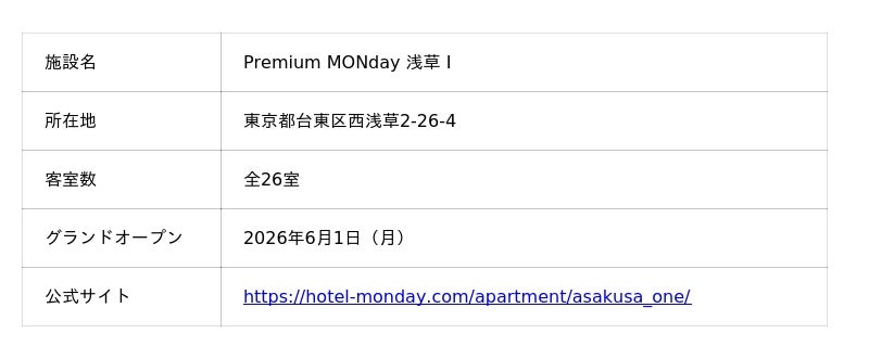 株式会社JHAT(本社:東京都、代表取締役:平林 朗)は、東京都台東区西浅草に、hotel MONday グループとして34施設目となる全26室のレジデンス型ホテル「Premium MONday 浅草I(プレミアム マンデー 浅草 ワン)」を、2026年6月1日(月)に開業いたします。