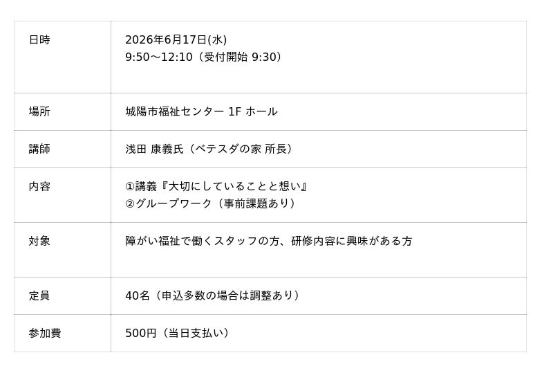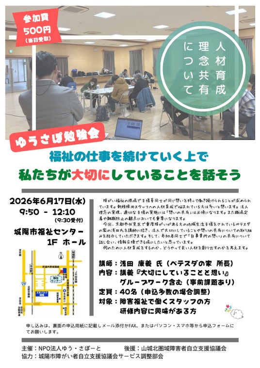 NPO法人ゆう・さぽーとは、2026年6月17日(水)、障がい福祉に従事するスタッフを対象とした勉強会「ゆうさぽ勉強会」を城陽市福祉センターにて開催いたします。